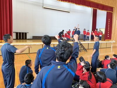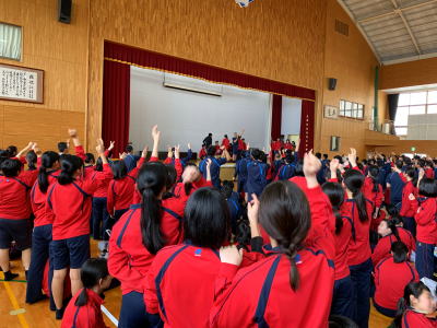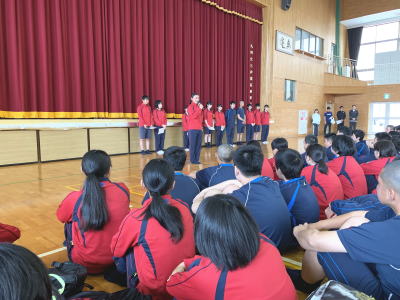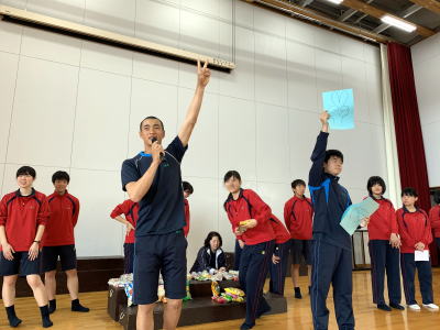 集合場所の鹿子前大芝生広場から九文高校まで歩いて移動し、本校体育館において生徒会(白蝶会)主催の新入生歓迎行事が行われました。校長先生が先頭に立って行われたじゃんけん大会は、大変な盛り上がりをみせ、学年・学級の垣根を越えて絆を深めることができていたようです。