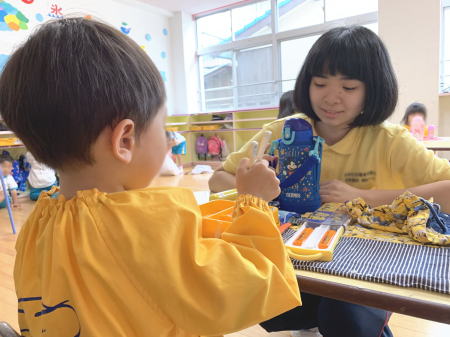 | 屋外での遊びを通して健やかな成長を促進しています。 | 一緒にお弁当を食べることで、食育について学びました。 | |