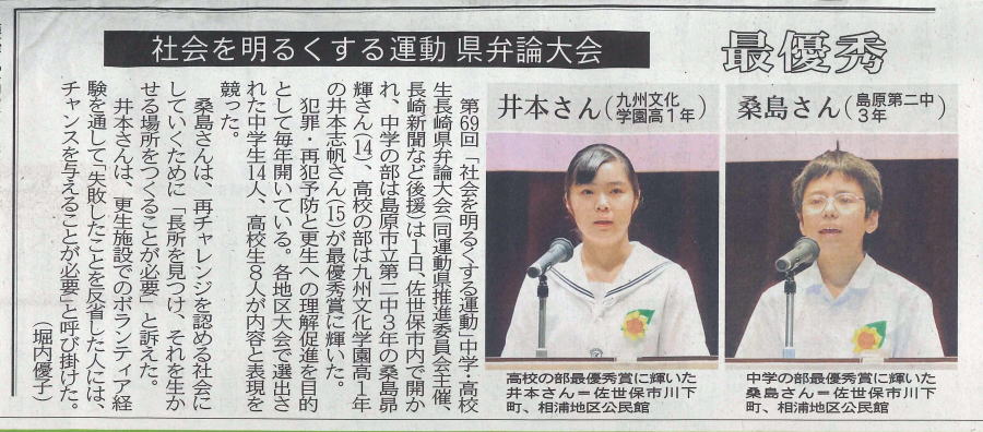 | 2019年8月9日 県大会でも最優秀賞をいただきました。(社会を明るくする運動弁論大会) |