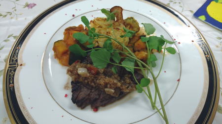 | 牛ランプのシャリアピンステーキ | 白桃ヨーグルトムース | |