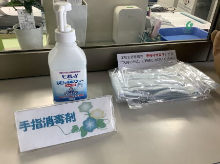 先日、生徒からプレゼントされた手作りマスクを玄関に用意しております。来校された際はご自由にお使いください。