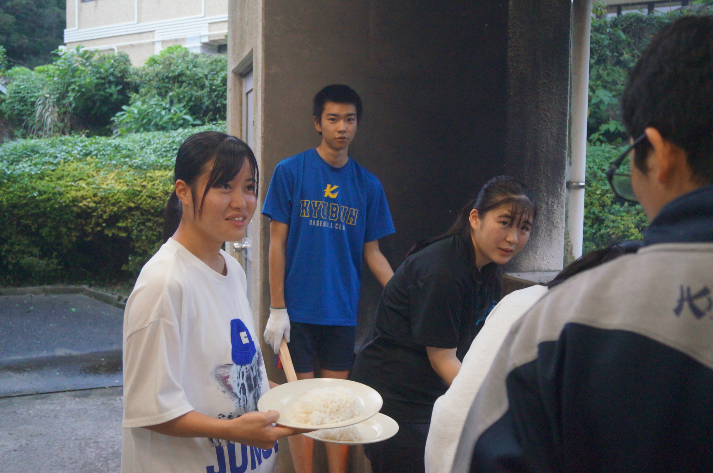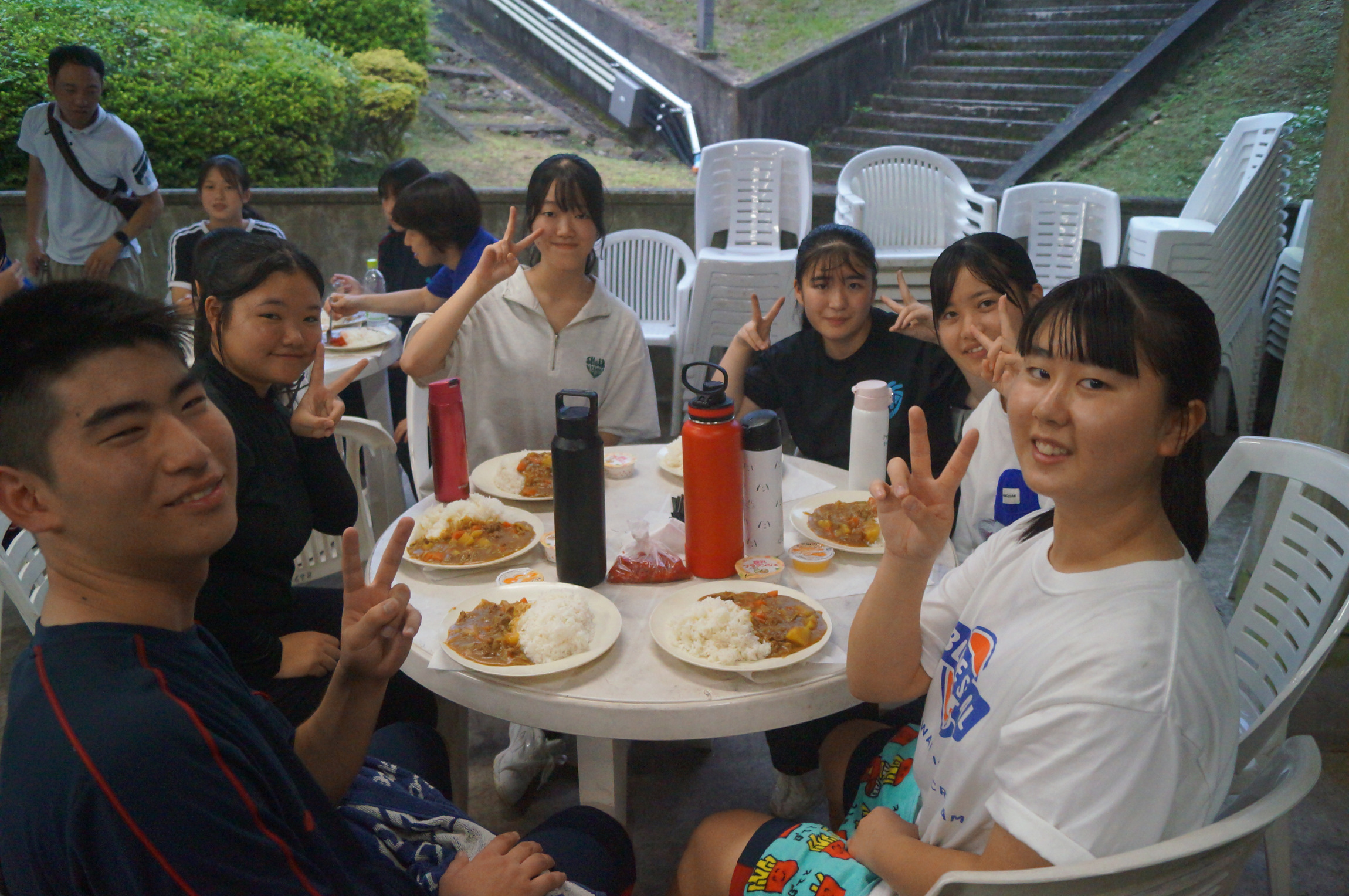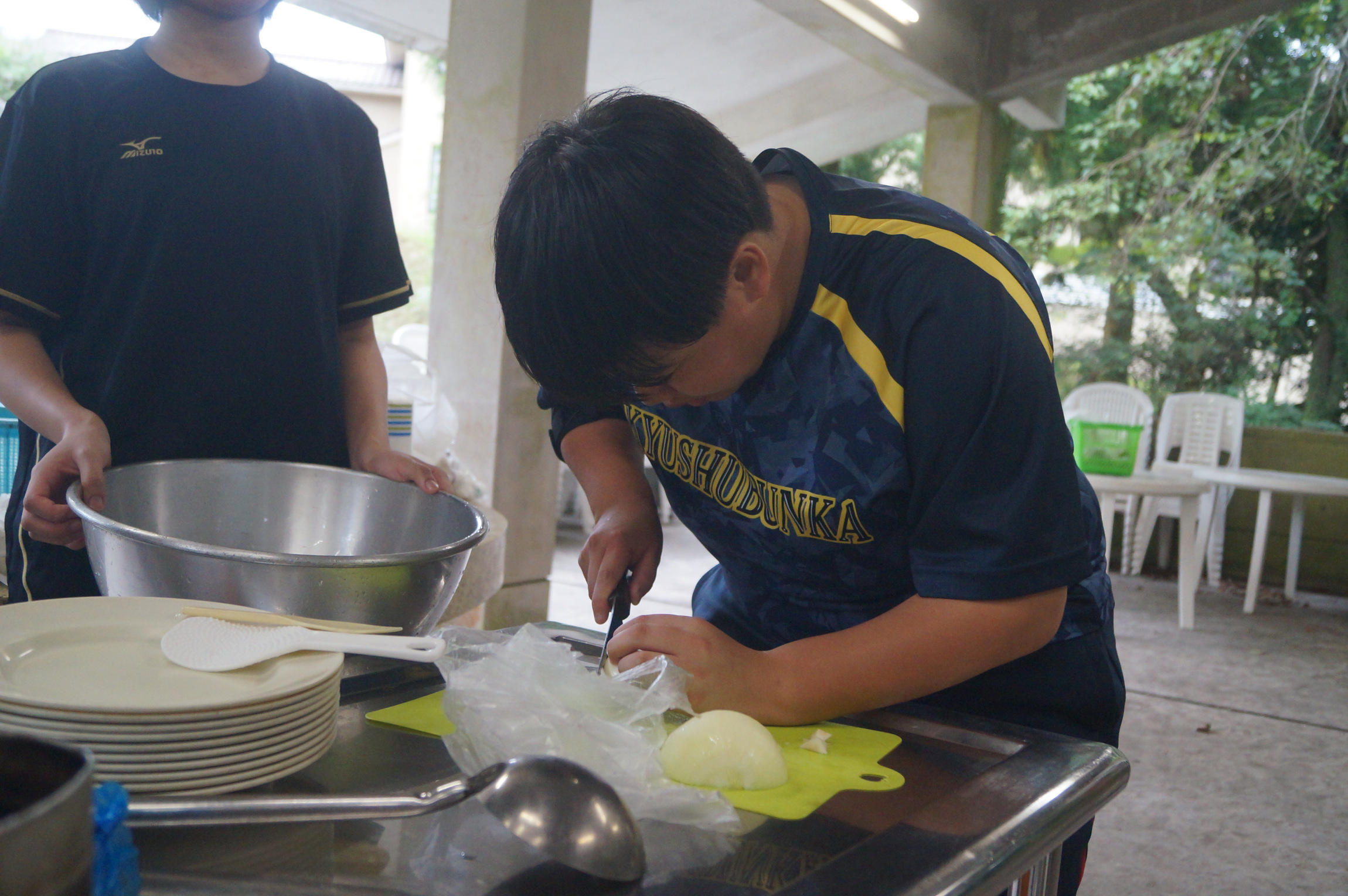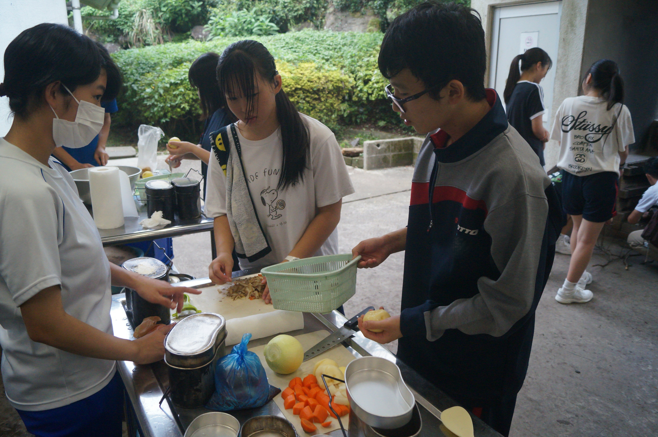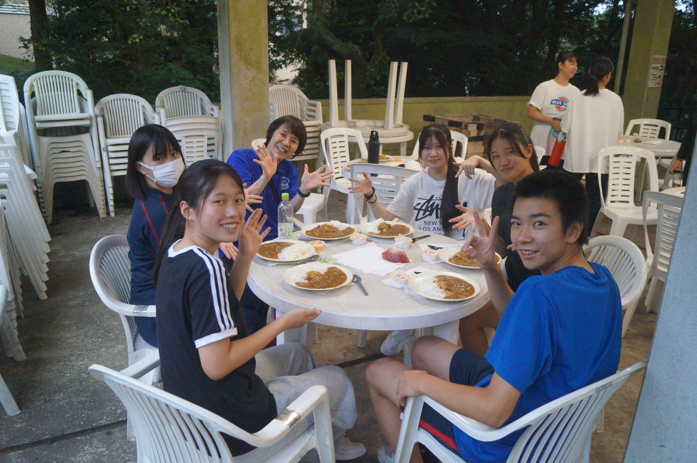 アイスブレイクで緊張をほぐし、その後の飯ごう炊飯ではカレーライスを協力して調理しました。