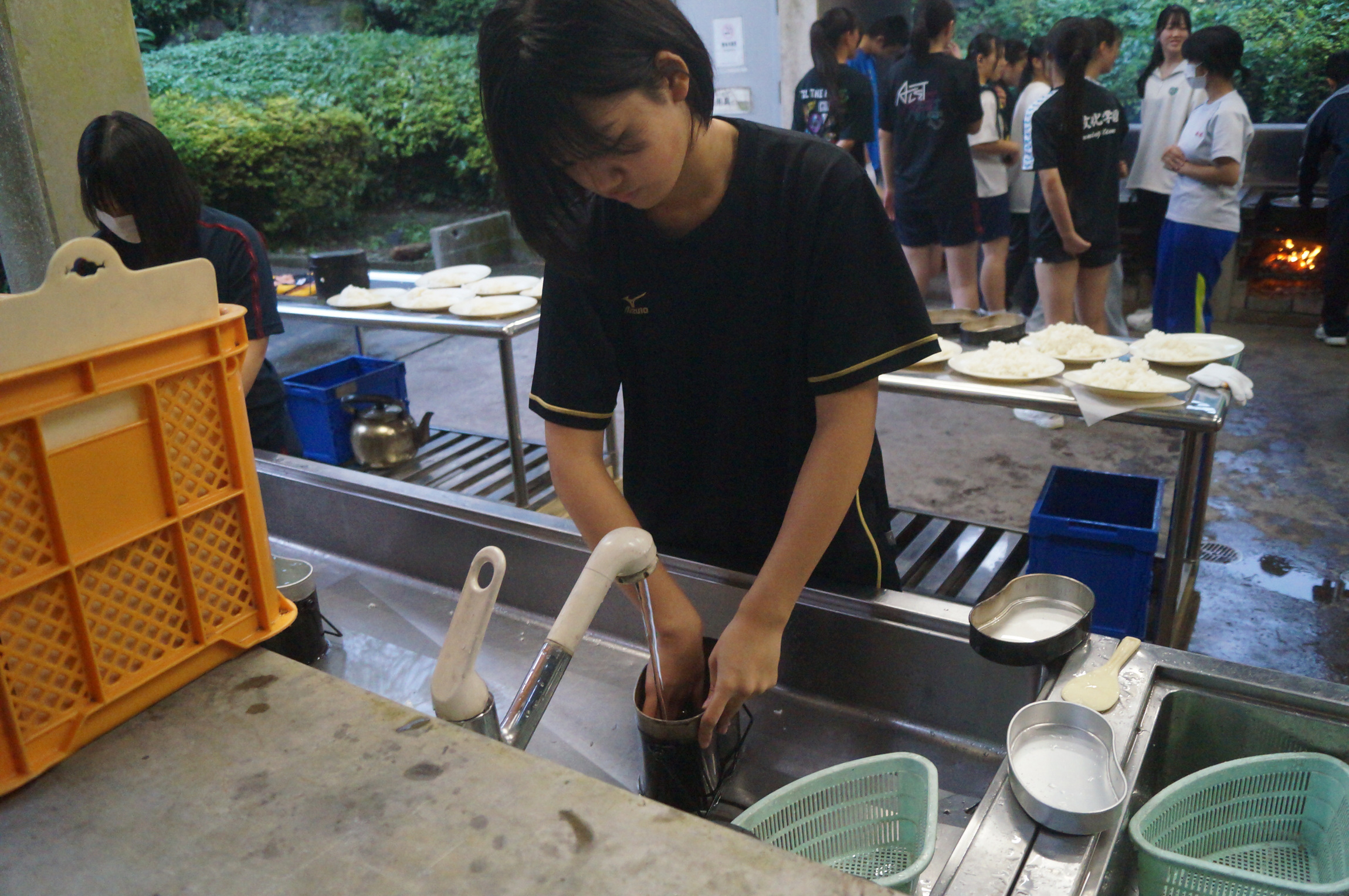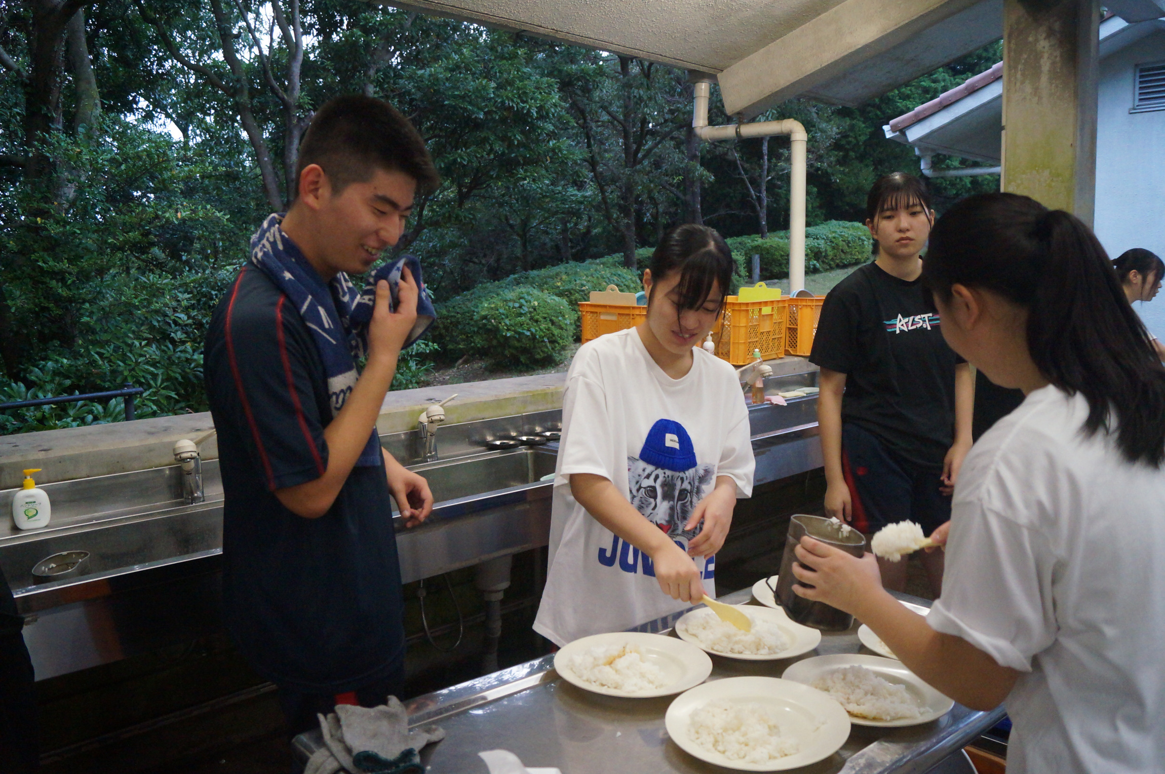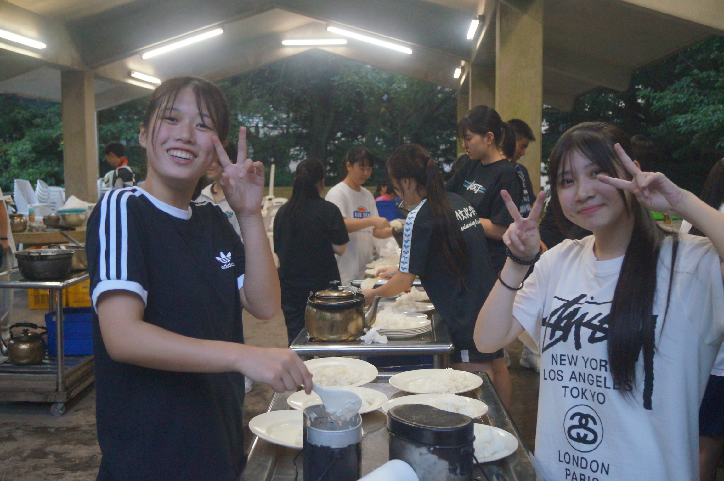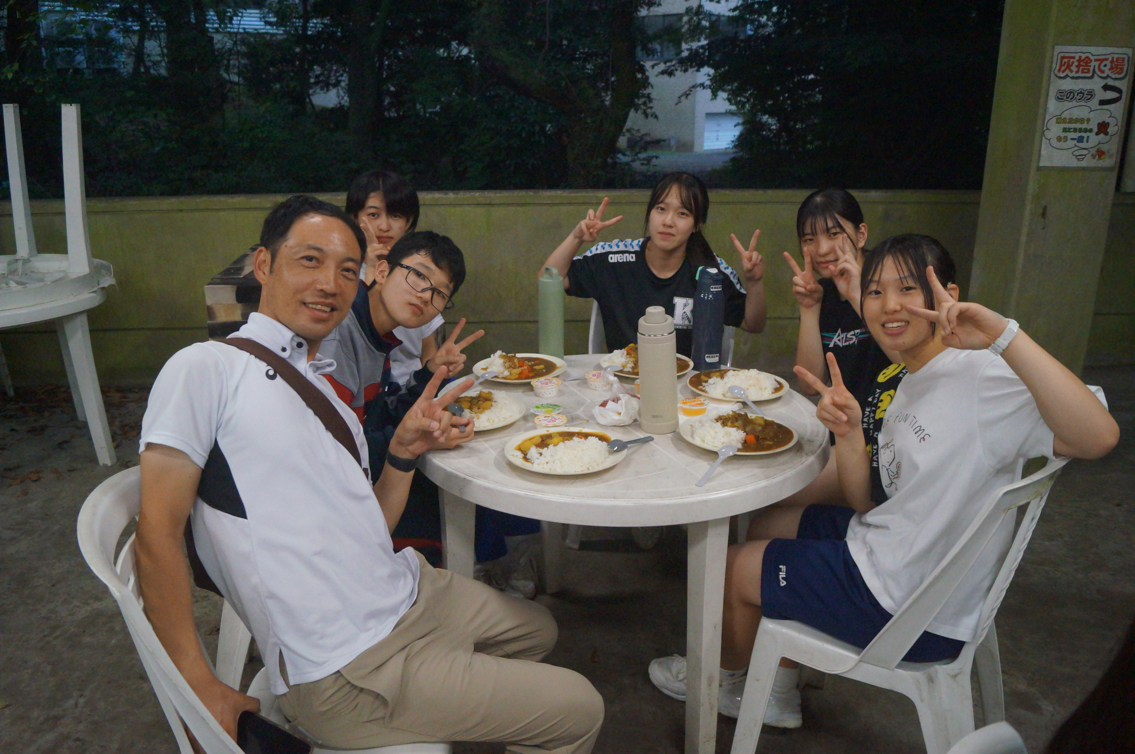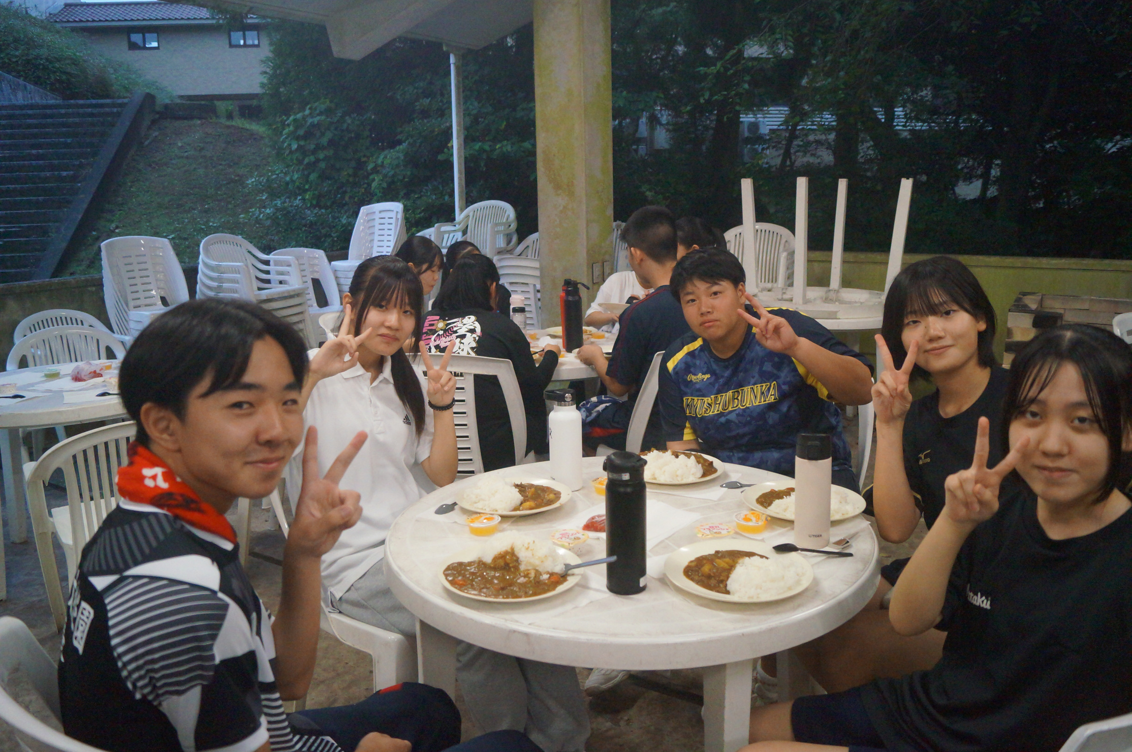 アイスブレイクで緊張をほぐし、その後の飯ごう炊飯ではカレーライスを協力して調理しました。