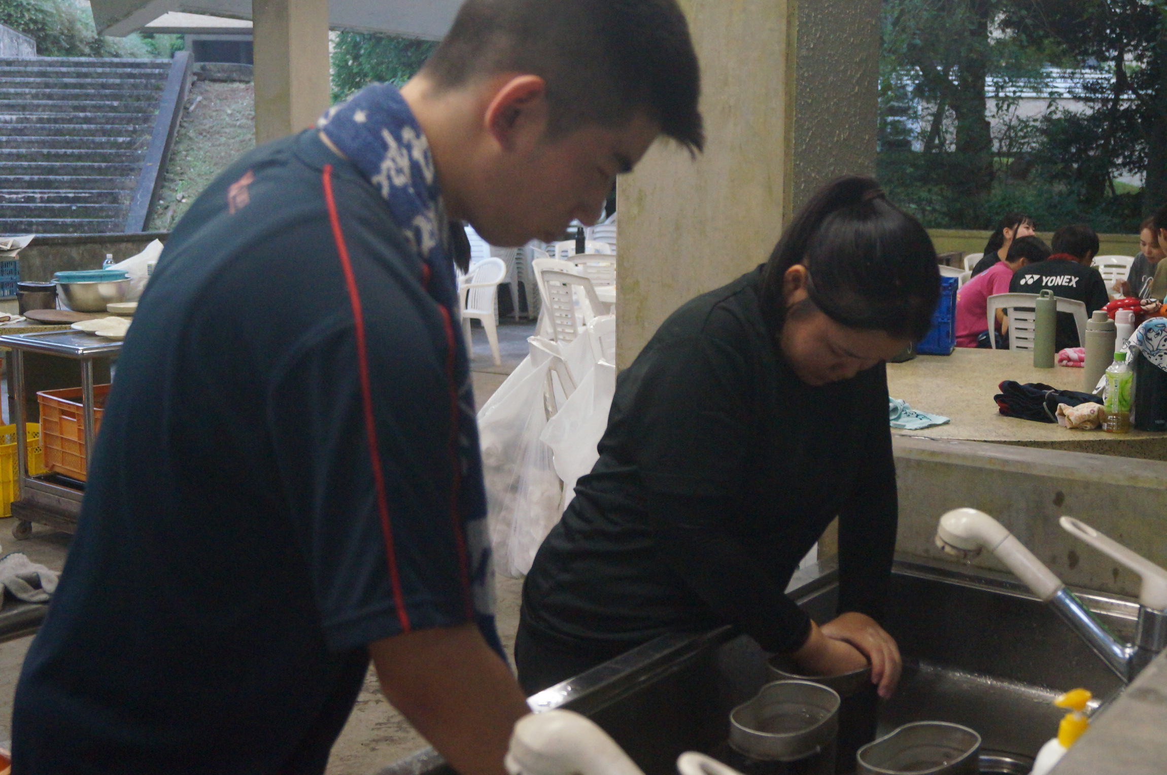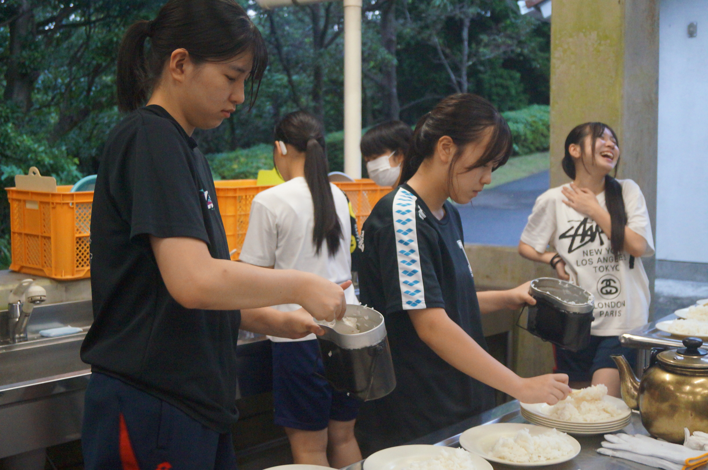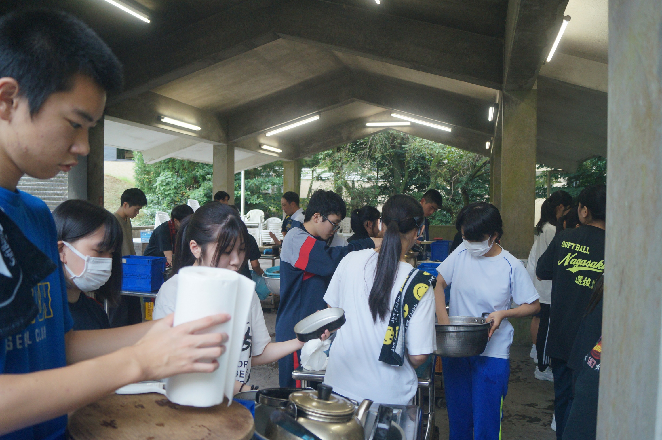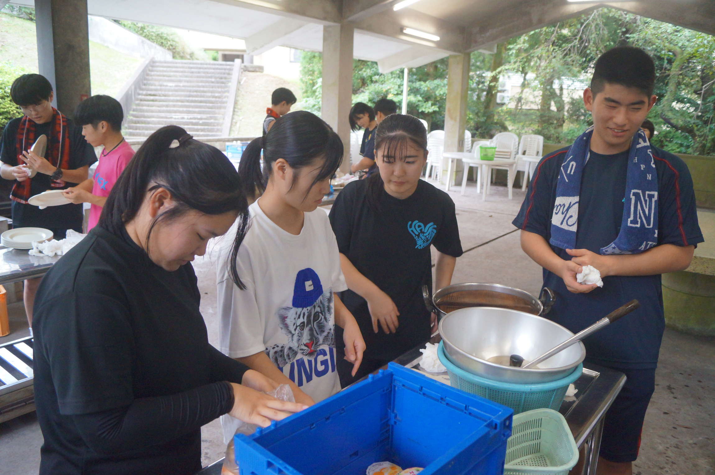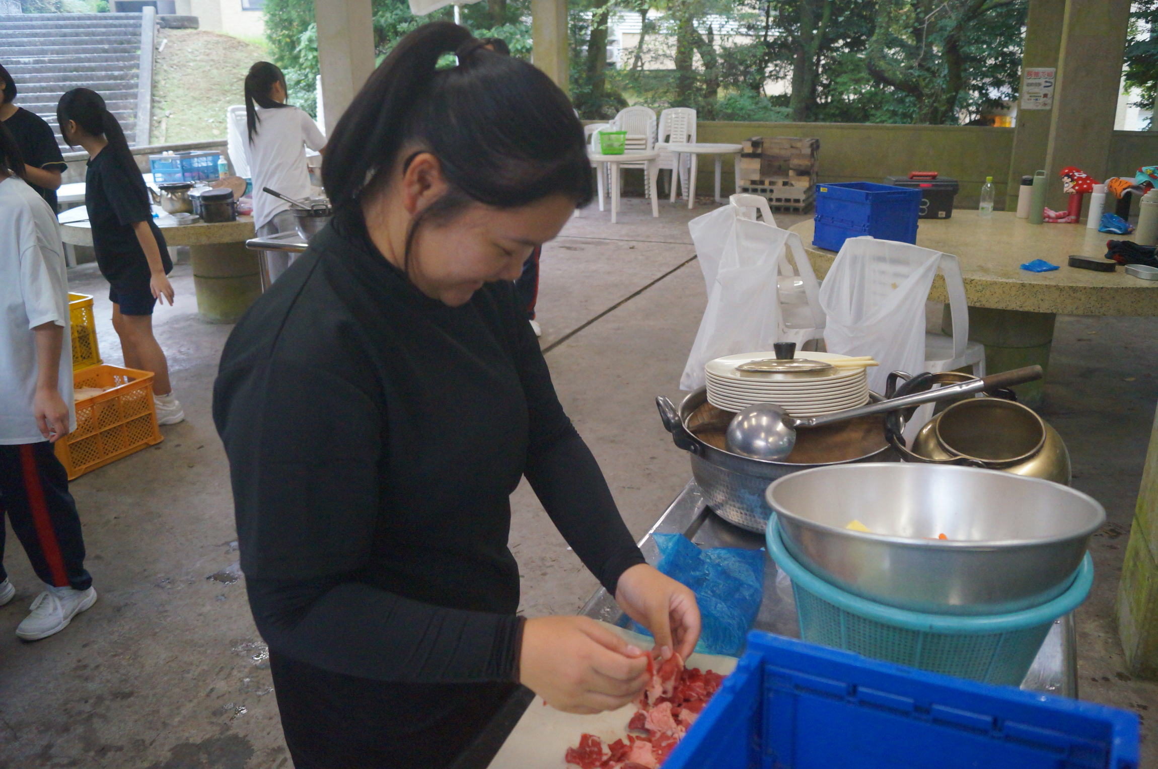 アイスブレイクで緊張をほぐし、その後の飯ごう炊飯ではカレーライスを協力して調理しました。