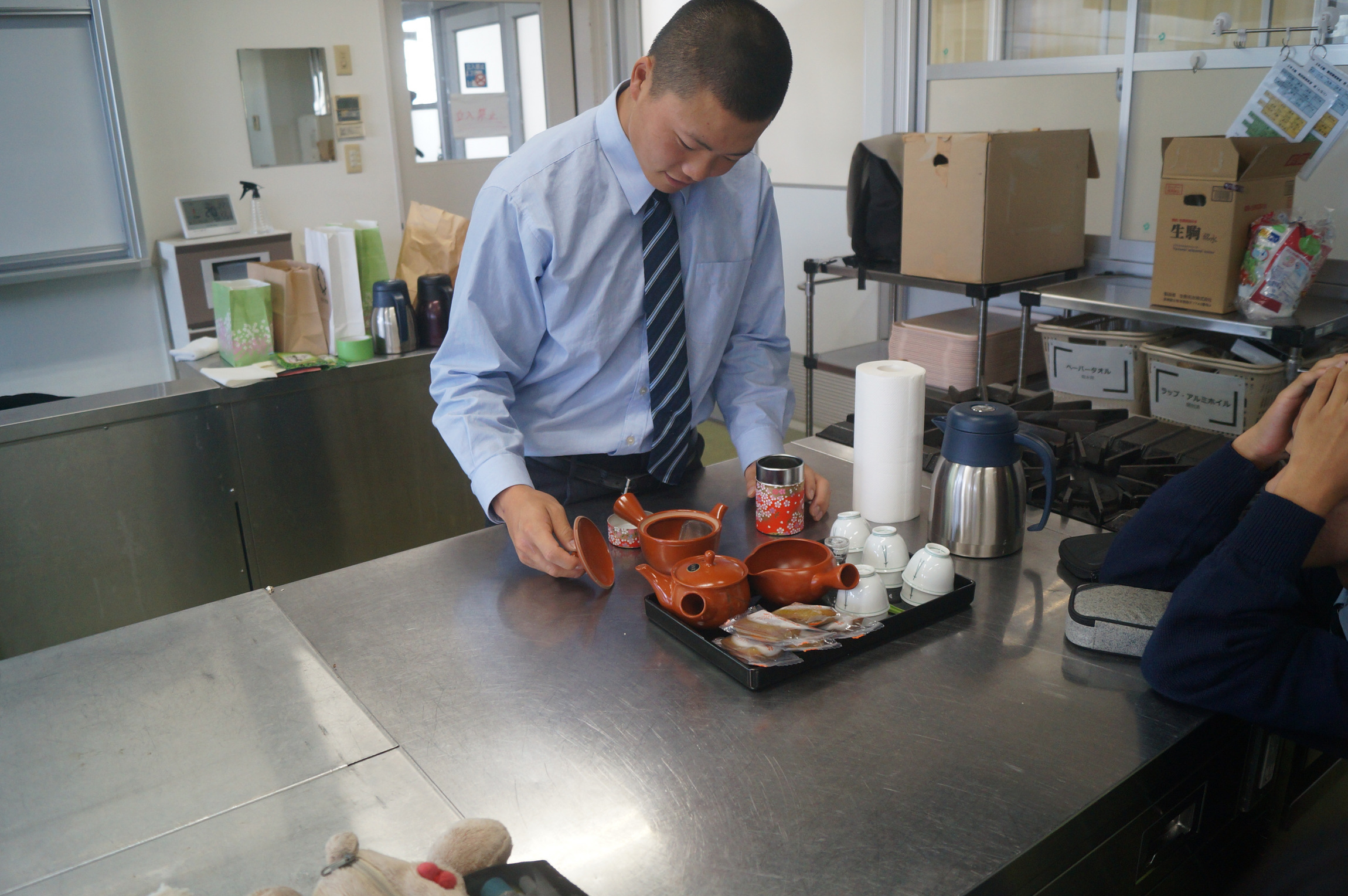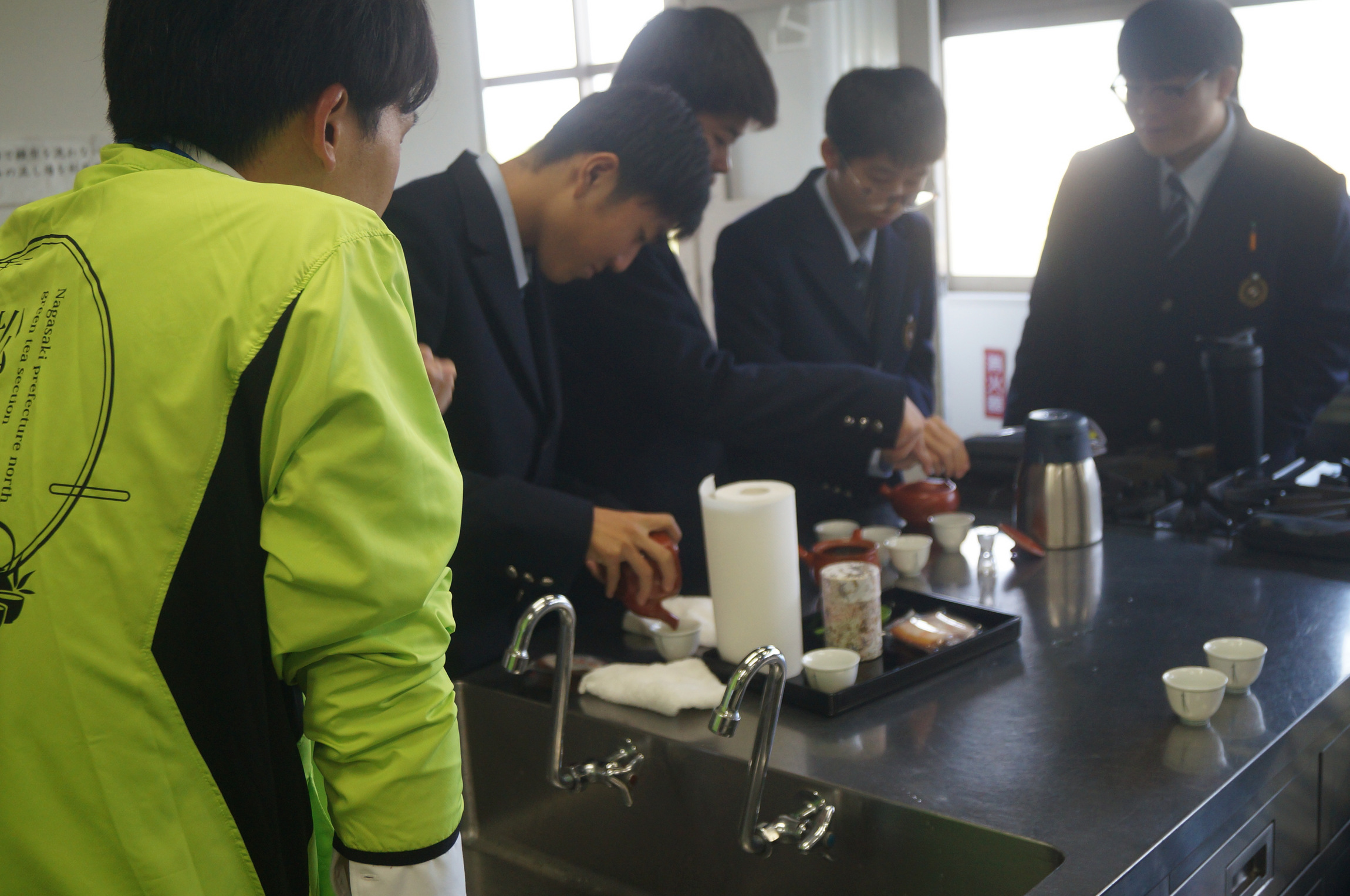 県北地域(佐世保市・松浦市・佐々町)を中心に活動されている若手茶生産者の団体「ながさきグリ茶研究会」の皆さまにお越しいただき、美味しいお茶を淹れるコツや基本的なマナーについてご指導いただきました。
