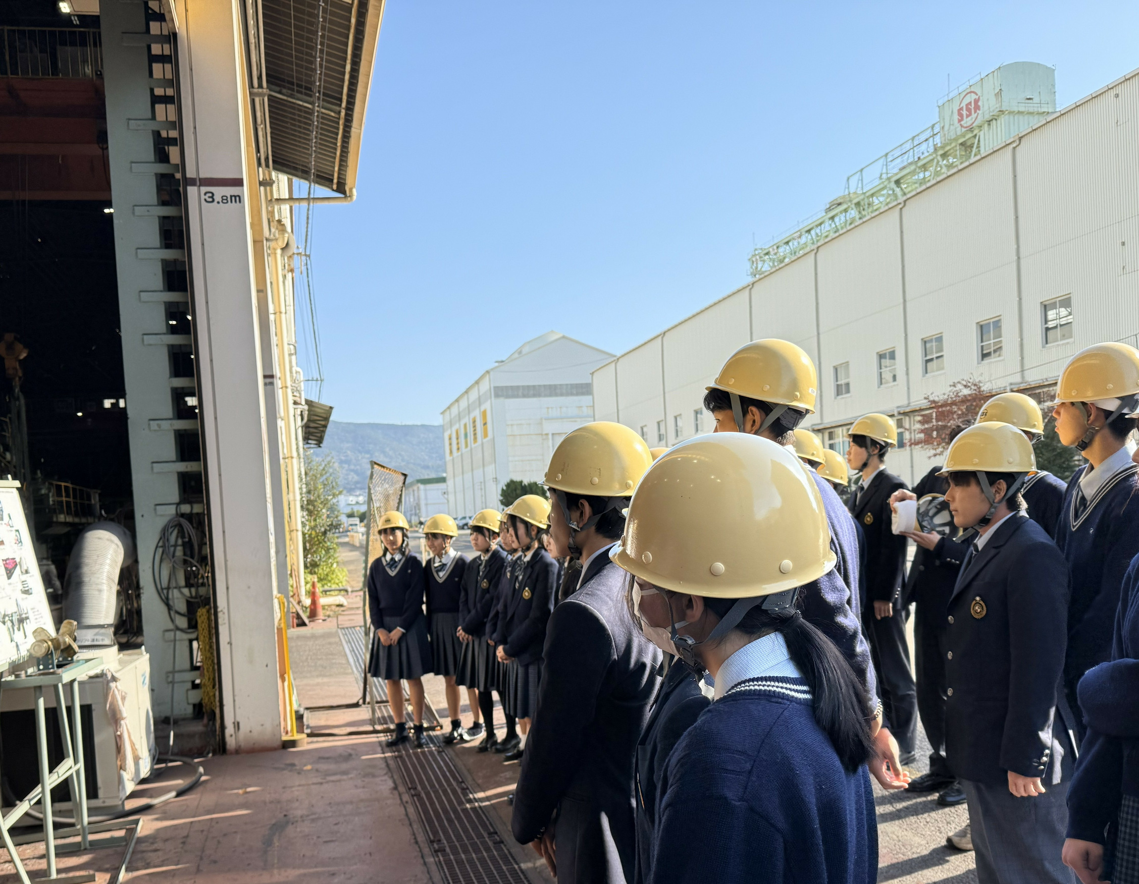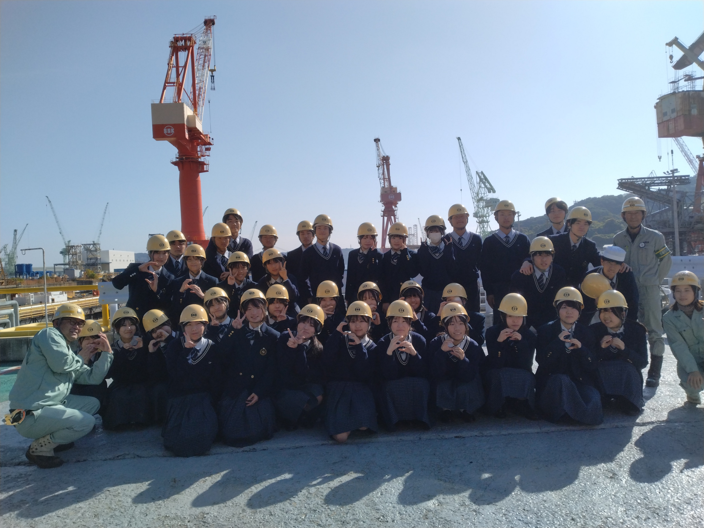 12月8日(月)の佐世保重工業株式会社様では、修繕船事業・機械事業の会社説明や敷地内の見学をさせていただきました。船舶用の機械や修繕中の自衛隊艦艇などを見て回り、携わっておられる仕事のスケールの大きさを感じました。普段外側から見る風景と中に入ってみる風景が大きく違い、新しい発見の連続でした。