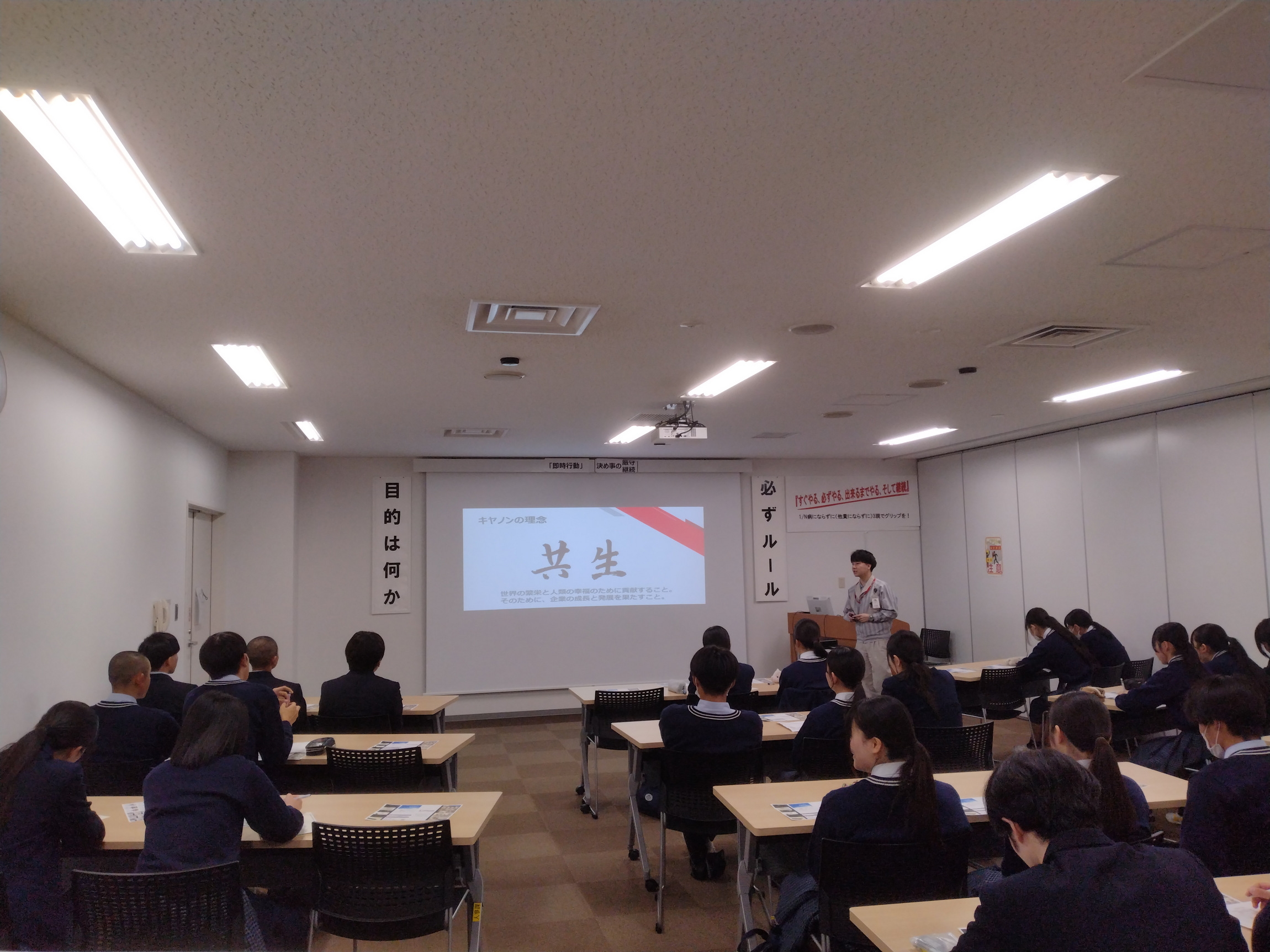 12月18日(木)の長崎キヤノン株式会社様では、カメラの製造ラインを詳しく見学させていただきました。部品の運搬も含めてオートメーション化が進んでおり、様々な機械を生徒は目を丸くして見ていました。実力主義を掲げられており、キャリアアップの意欲がある人材に報いることができる仕組みに生徒は魅力を感じていました。