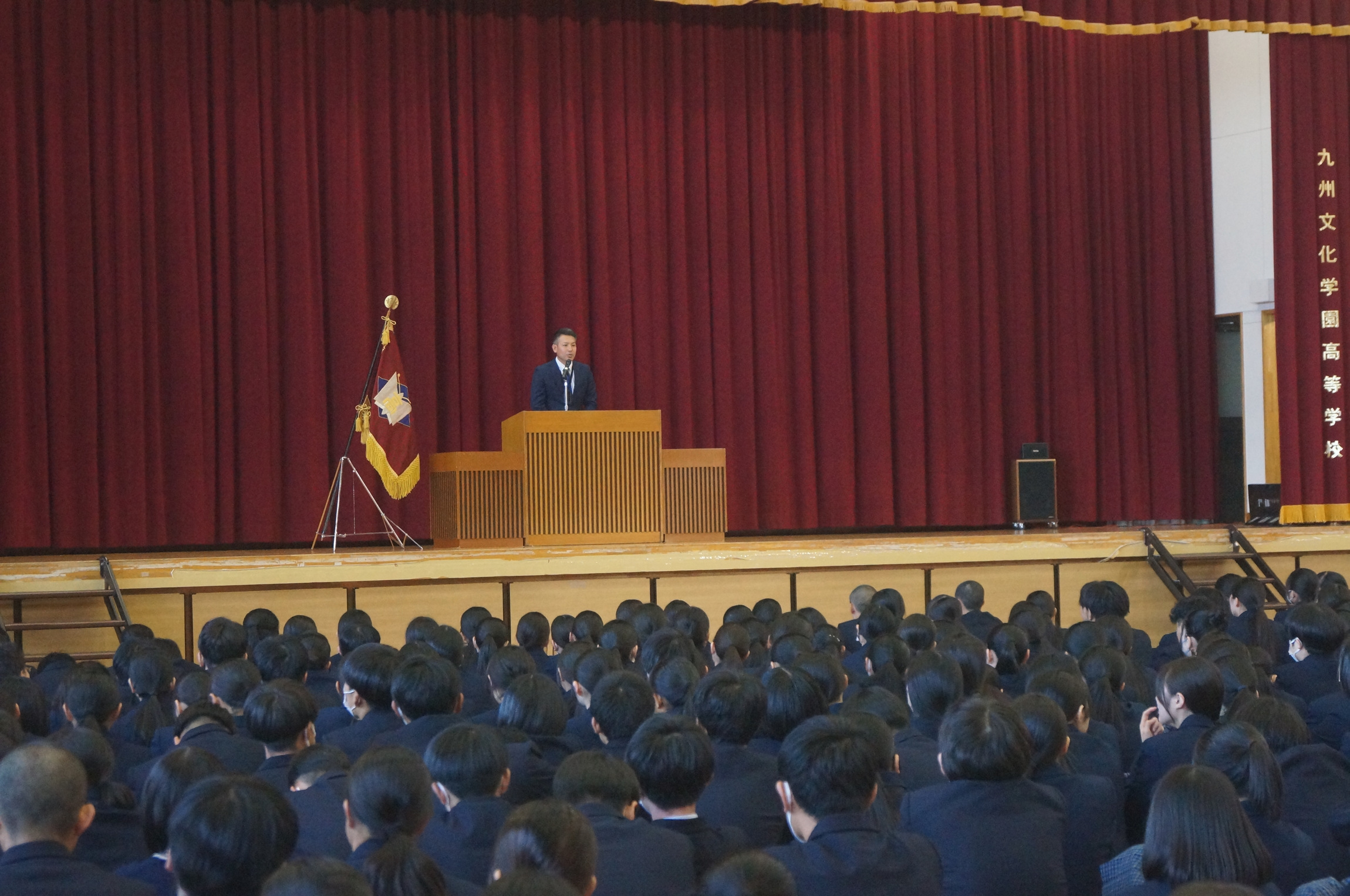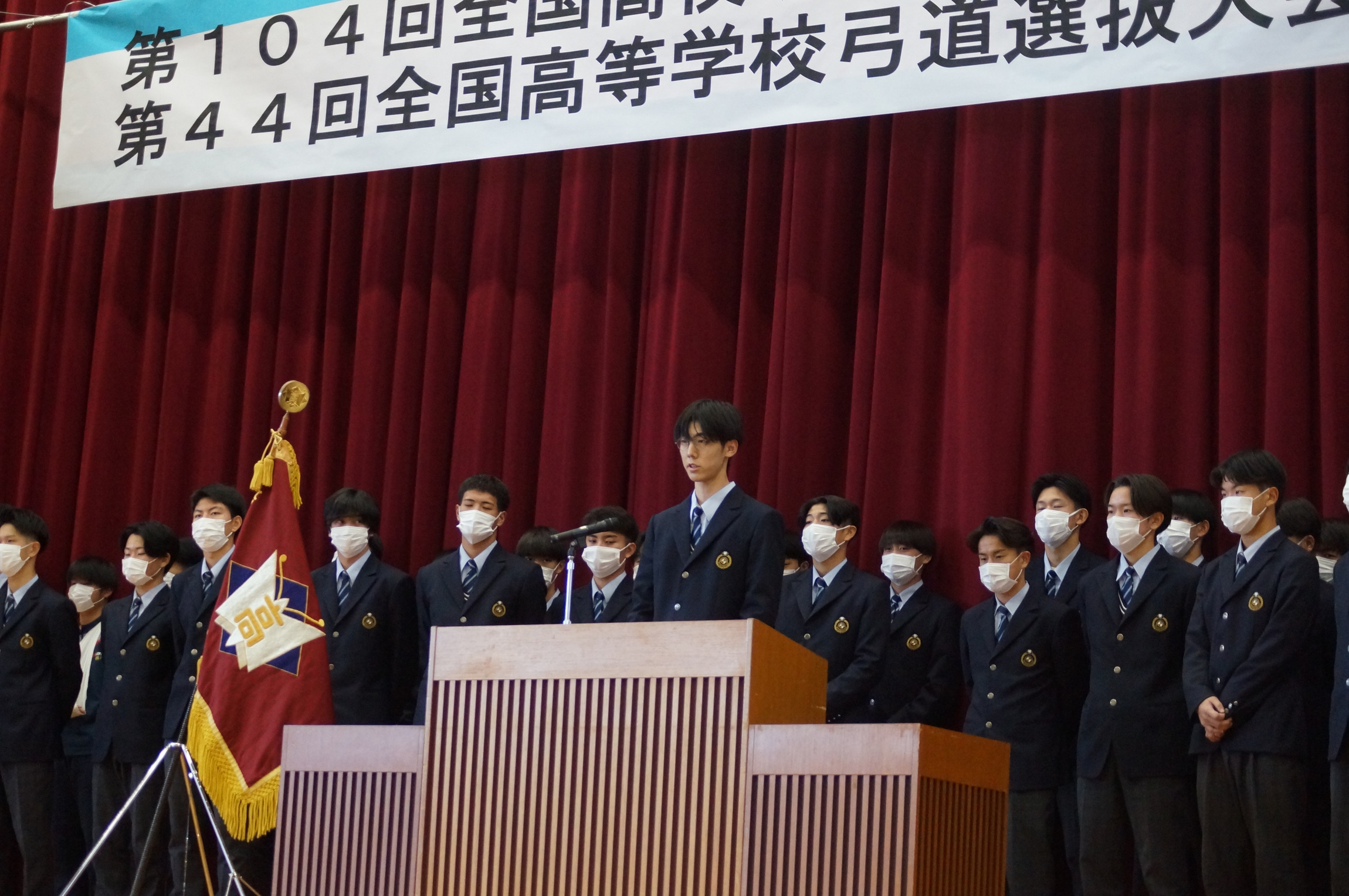 壮行式では、サッカー部が全国高等学校サッカー選手権大会へ、弓道部男子個人が全国大会へ出場することが紹介され、椎木町自治会志波様、佐世保市サッカー協会紫垣様より、激励のご挨拶を頂きました。また全校生徒から温かい拍手が送られました。出場生徒代表からは、感謝と大会に向けた決意が述べられました。