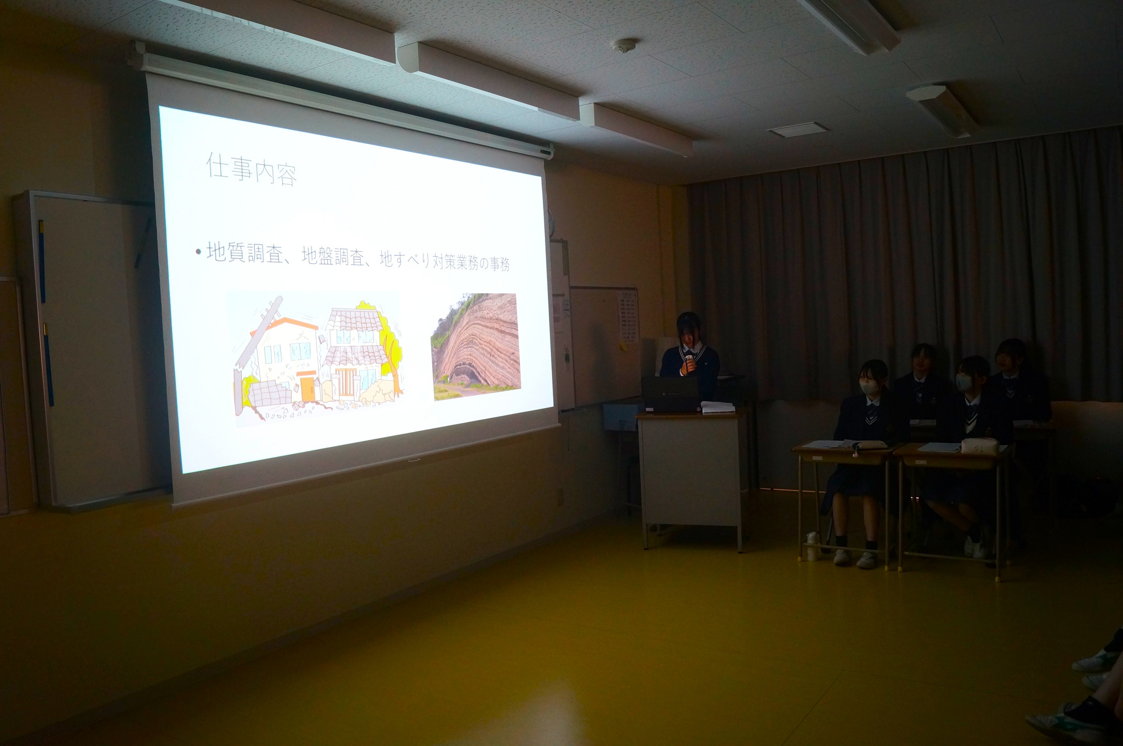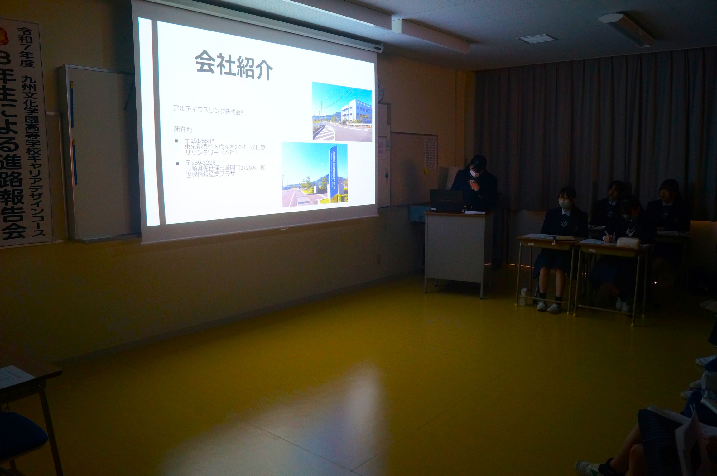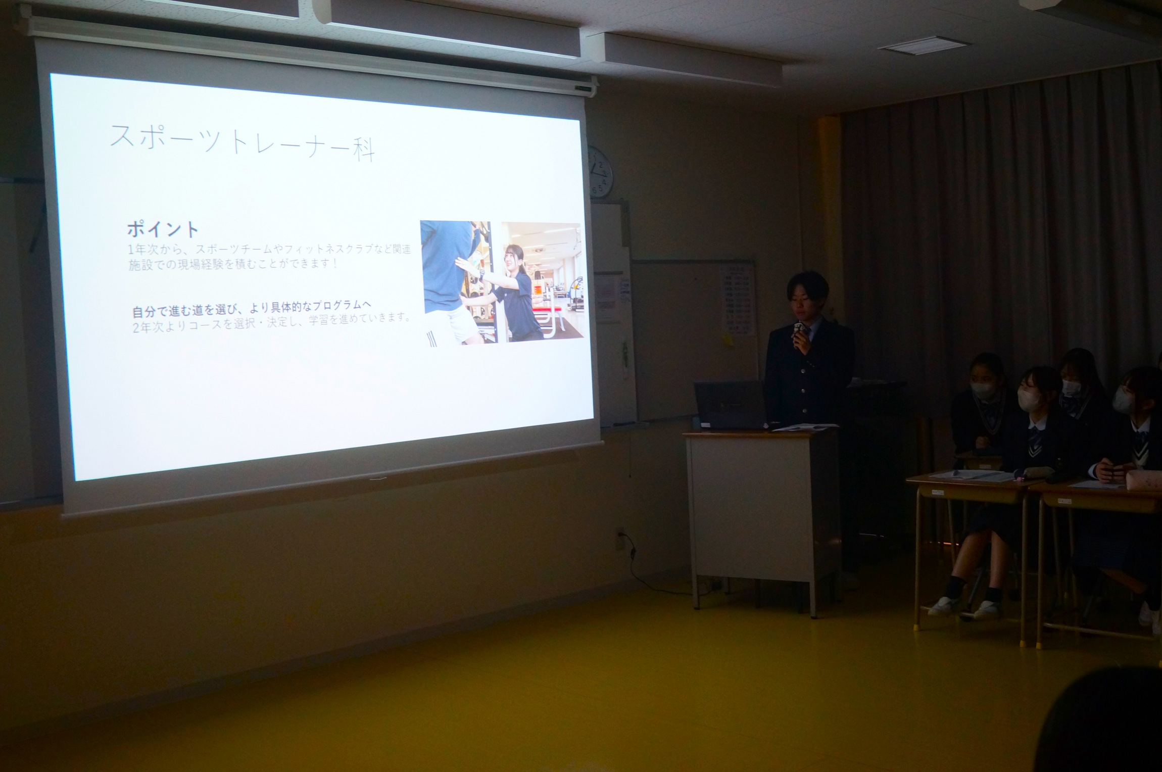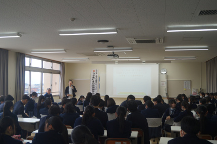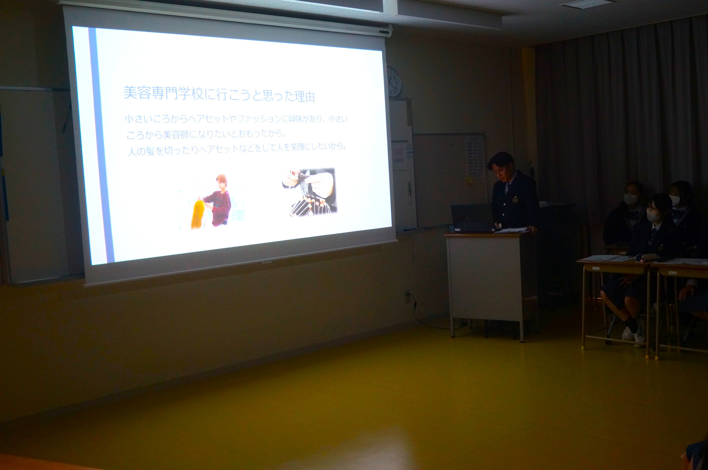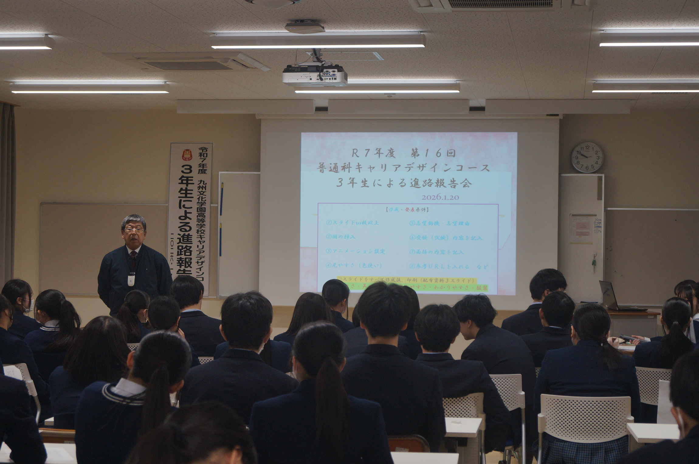 普通科キャリアデザインコースの3年生による進路報告会が1月20日(火)に実施されました。報告会では、就職班と進学班に分かれて成果報告をしました。報告内容は、「企業や学校の紹介」、「志望動機」、「受験に関すること」、「進路実現のために心がけておくこと」で、1・2年生も参加し、先輩たちの貴重な体験談やアドバイスを直接聞くことができました。後輩たちは自分の進路選択についてとても参考になったと思います。そして、3年生はこの報告会を通じて卒業後の目標に向かって頑張っていきたいというモチベーションが高まったと思います。