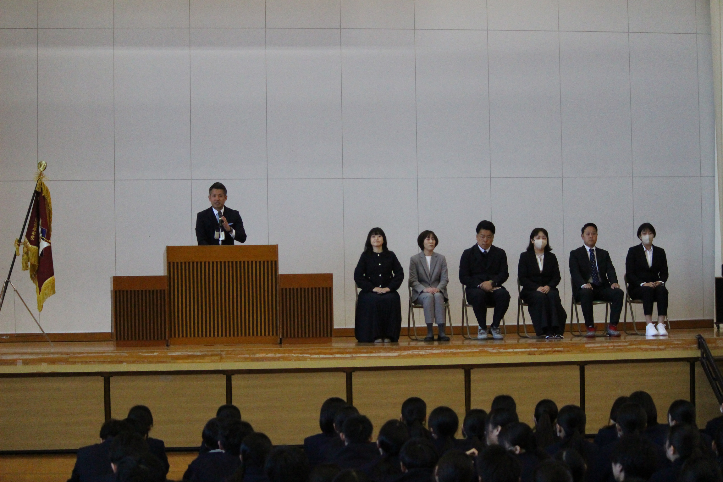 式では、今年度新たに着任された先生方の紹介があり、生徒たちは新しい出会いに期待を膨らませている様子でした。続いて、各クラスの担任・副担任等の発表が行われ、新年度の体制が整いました。